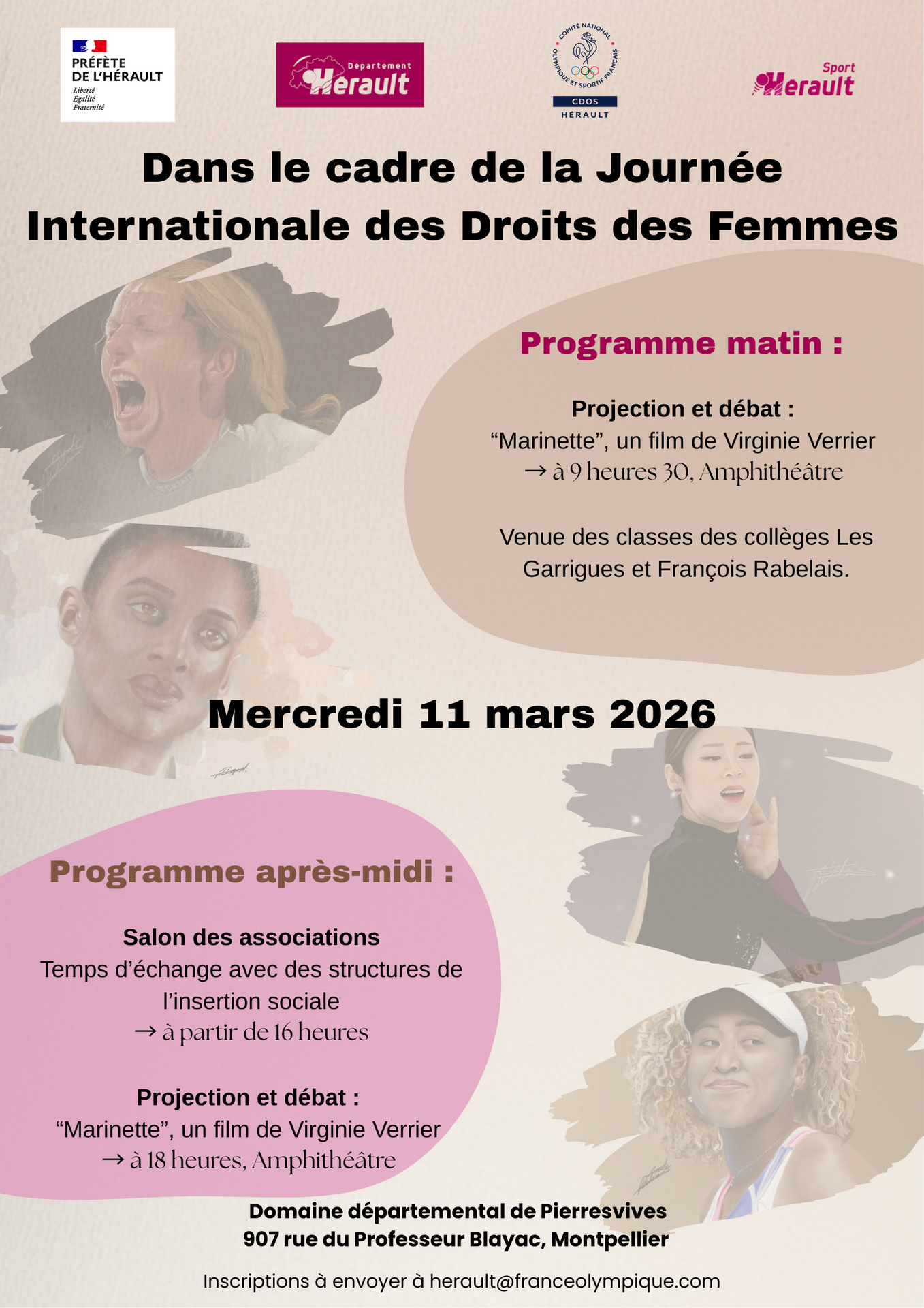 Le Comité Départemental Olympique et Sportif de l’Hérault propose dans le cadre de la Journée internationale des droits des femmes, avec le concours du Service départemental à la jeunesse, à l’engagement et aux sports, du Département de l’Hérault et d’Hérault Sport, la projection du film « Marinette » de Virginie Verrier.