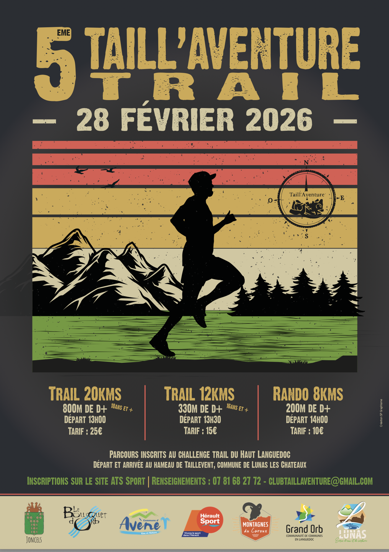 Le club Taill’Aventure propose avec le concours des Villes de Lunas les Châteaux, Joncels, le Bousquet d’Orb, Avène de la communauté de Communes Grand Orb, du Département de l’Hérault et le soutien logistique d’Hérault Sport, son cinquième Trail éponyme sur des parcours inscrits au Challenge Trail du Haut Languedoc.
